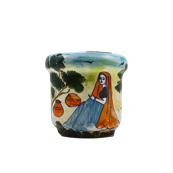 This handcrafted illustrated blue pottery ceramic planter is a statement décor piece that blends traditional storytelling with functional design. Handmade by skilled artisans and finished with detailed hand-painted illustrations inspired by village life, culture, and nature, each planter carries its own visual narrative. Ideal for indoor plants, herbs, or decorative use, its balanced form works beautifully on floors, consoles, and shelves. Natural variations in illustration, brushwork, and glaze highlight the authenticity of handmade craftsmanship, ensuring every piece is truly one of a kind.